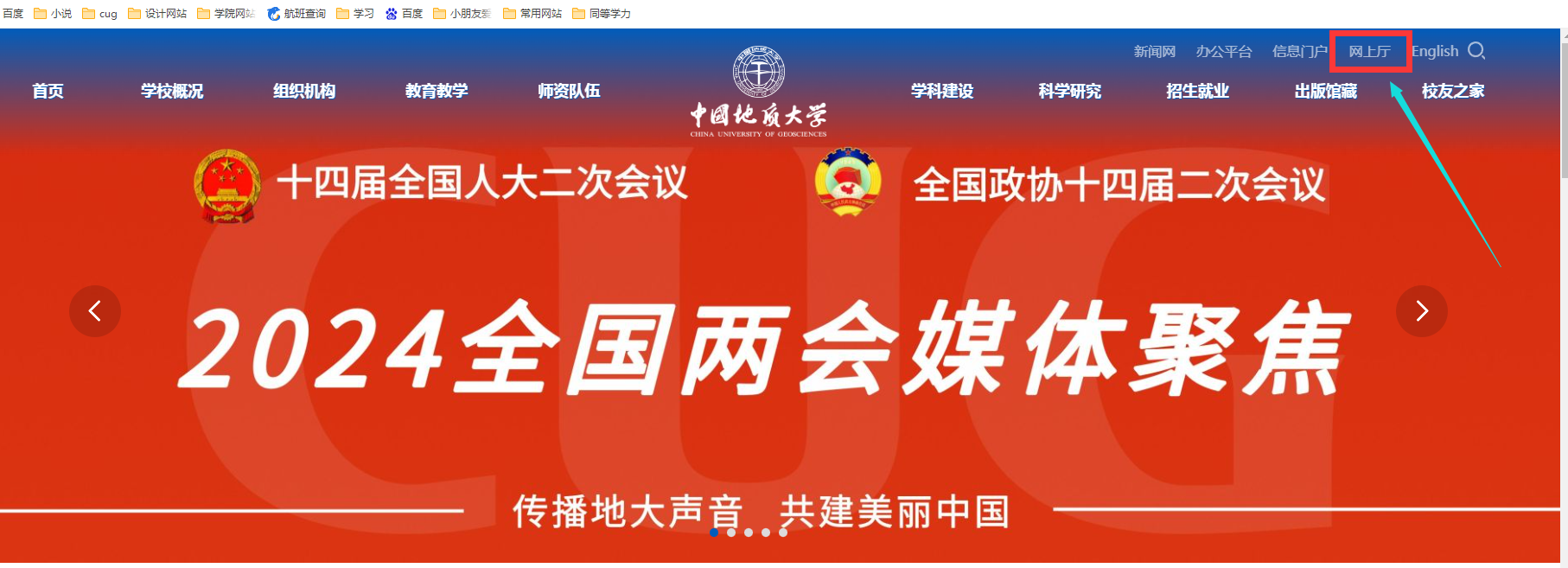 1、登录学校网站(https://www.cug.edu.cn/)或者学院网站(/)点击“网上厅”