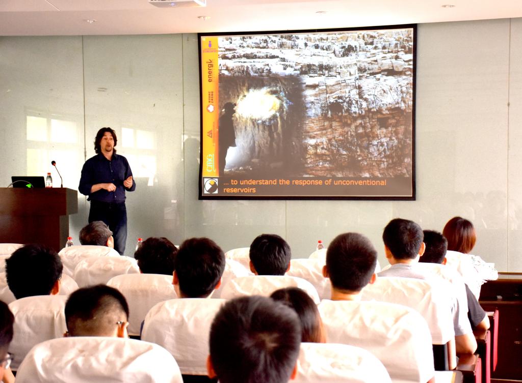 Grasselli教授以“Advancements in experimental and numerical methods in rock physics and rock mechanics”为题,通过室内试验以及数值模拟的方法展示了裂隙扩展的机理。数值模拟中使用Grasselli教授团队基于FDEM开发的软件,精彩的动画以及生动的讲解获得了在场师生的阵阵掌声。报告结束后,Grasselli教授与师生们展开了十分精彩的问答环节,令在场师生们受益颇丰。