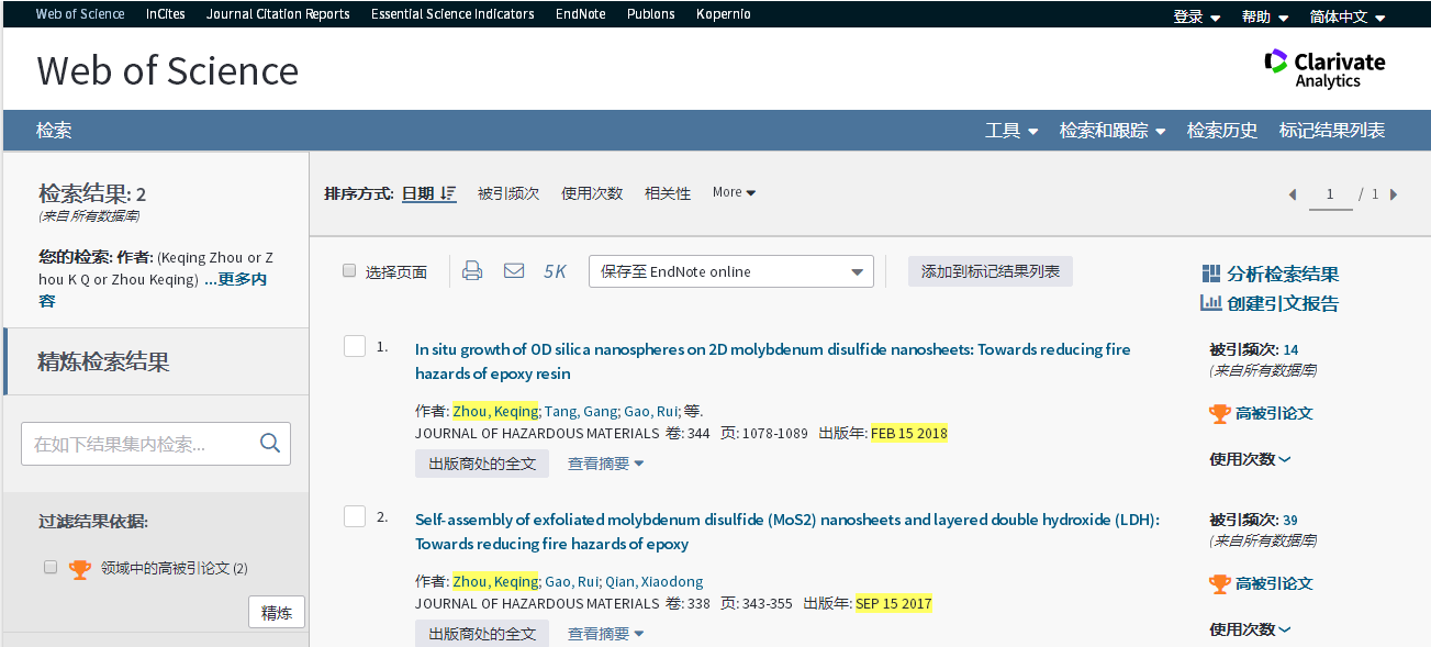 基本科学指标数据库(Essential Science Indicators,简称ESI)最新数据显示,安全工程系周克清老师发表的论文“In situ growth of 0D silica nanospheres on 2D molybdenum disulfide nanosheets: Towards reducing fire hazards of epoxy resin”入选高被引论文。该论文是周克清老师以中国地质大学(武汉)十大买球官方网站为第一单位、第一作者和通讯作者身份发表的第2篇ESI高被引论文。2018年7月周克清老师发表的论文“Self-assembly of exfoliated molybdenum disulfide (MoS2) nanosheets and layered double hydroxide (LDH): Towards reducing fire hazards of epoxy”曾同时入选ESI高被引论文和热点论文。