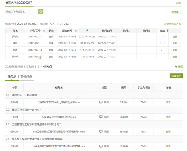 《工程项目管理》课程的学生课后作业和在线学习完成情况的监督统计