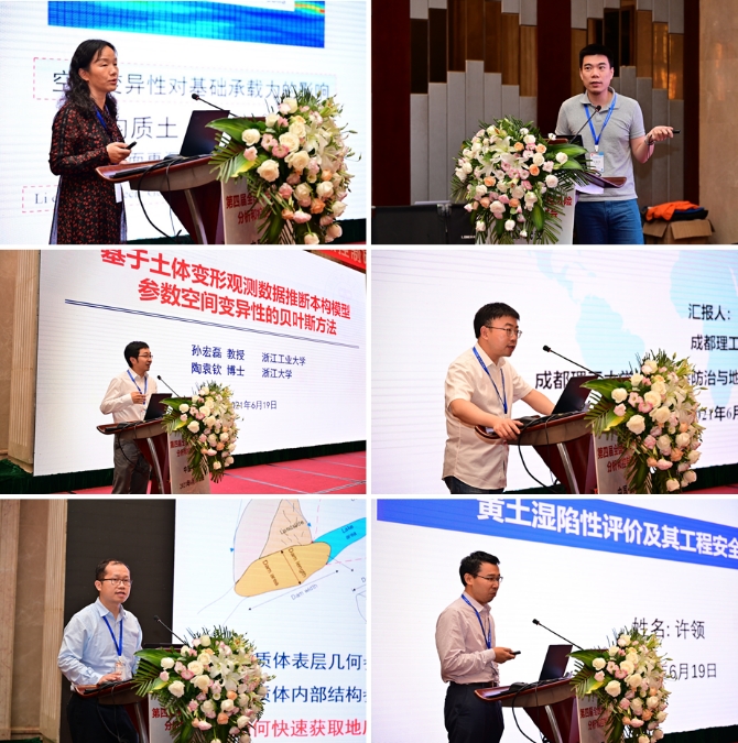 会议期间,各位专家学者以目前各自所属的专业方向及具体研究成果为主要内容,为线下线上参会人员作了精彩的学术报告。中国地质大学(武汉)唐辉明教授以《基于演化的滑坡防控理论与方法技术》为题作会议特邀报告,美国克莱姆森大学C. Hsein Juang教授在线上作《地质/地层/岩土模型不确定性的量化及影响评价》的特邀报告,同济大学黄宏伟教授以《工程风险管控存在的问题与适应性风险管理》为题作特邀报告,武汉大学李典庆教授以《Copula理论在岩土工程不确定性与可靠性分析中应用进展》为题作特邀报告,重庆大学周小平教授以《场富集有限元法及其应用》为题作特邀报告,中国大地保险张帆总经理应邀以《IDI的实践与思考》为题作特邀报告。