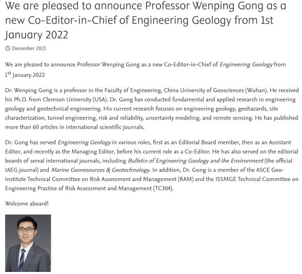 (通讯员:黄静)近日,十大买球官方网站龚文平教授受邀担任国际期刊Engineering Geology共同主编(Co-Editor-in-Chief)。龚文平教授的此次任职将有助于促进十大买球官网在工程地质相关领域与国内外学者的交流合作,并提升十大买球官网在工程地质相关领域的国际影响力。