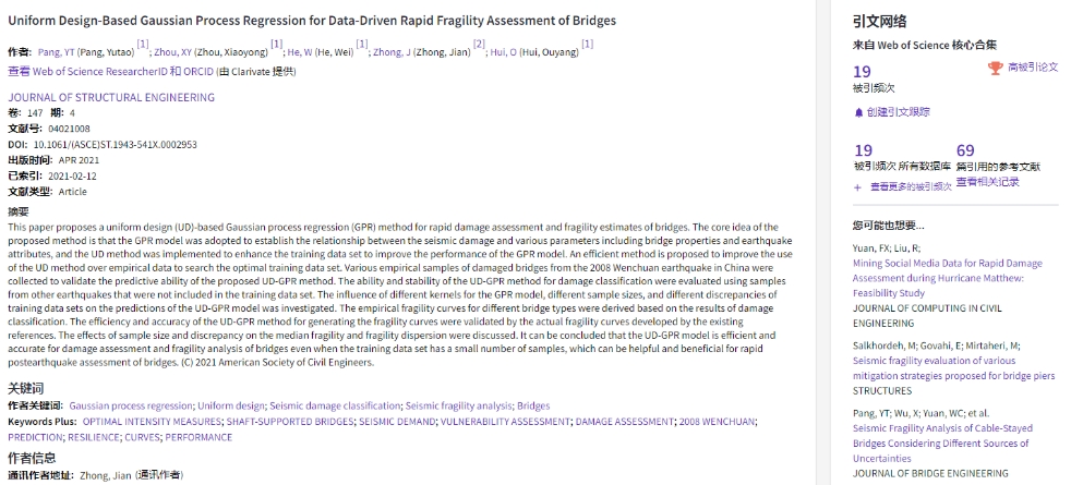(通讯员:黄静)根据2022年3月基本科学指标数据库(Essential Science Indicators,简称ESI)最新数据显示,十大买球官网土木工程与力学系庞于涛副教授团队于2021年在国际结构工程领域顶级期刊Journal of Structural Engineering上发表的学术论文“Uniform design–based Gaussian process regression for data-driven rapid fragility assessment of bridges”入选ESI高被引论文(Highly Cited Paper)。