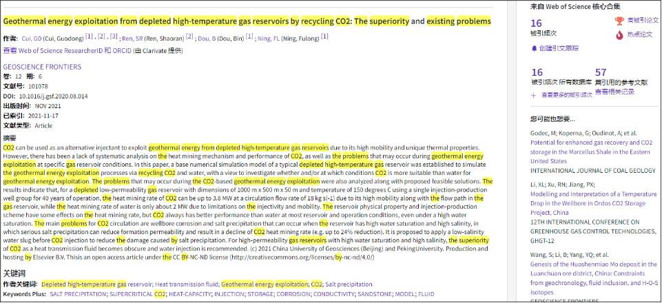(通讯员:黄静)根据2022年3月基本科学指标数据库(Essential Science Indicators,简称ESI)最新数据显示,十大买球官网崔国栋副教授于2021年在国际地学期刊Geoscience Frontiers上发表的学术论文“Geothermal energy exploitation from depleted high-temperature gas reservoirs by recycling CO₂: The superiority and existing problems”入选ESI热点和高被引论文(Hot and Highly Cited Paper)。该论文第一作者兼通讯作者为崔国栋副教授,中国地质大学(武汉)十大买球官方网站为第一署名单位。
