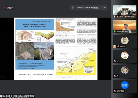 讲座结束后,李长冬教授对焦赳赳教授的精彩报告表示了感谢,随后参会师生针对承压水对边坡稳定性影响及治理方法、边坡稳定性评价行业规范编制、边坡稳定性分析中合理选取和考虑地下水位线、高密度建筑群对山地城市边坡稳定性影响等相关内容进行了深入讨论和交流。最后唐辉明教授对本次学术讲座活动进行了总结发言,感谢了焦赳赳教授的精彩学术报告,强调了地下水驱动和结构主控在滑坡灾害研究中的重要性,并希望今后十大买球官网能够持续稳定开展同香港大学的合作交流。