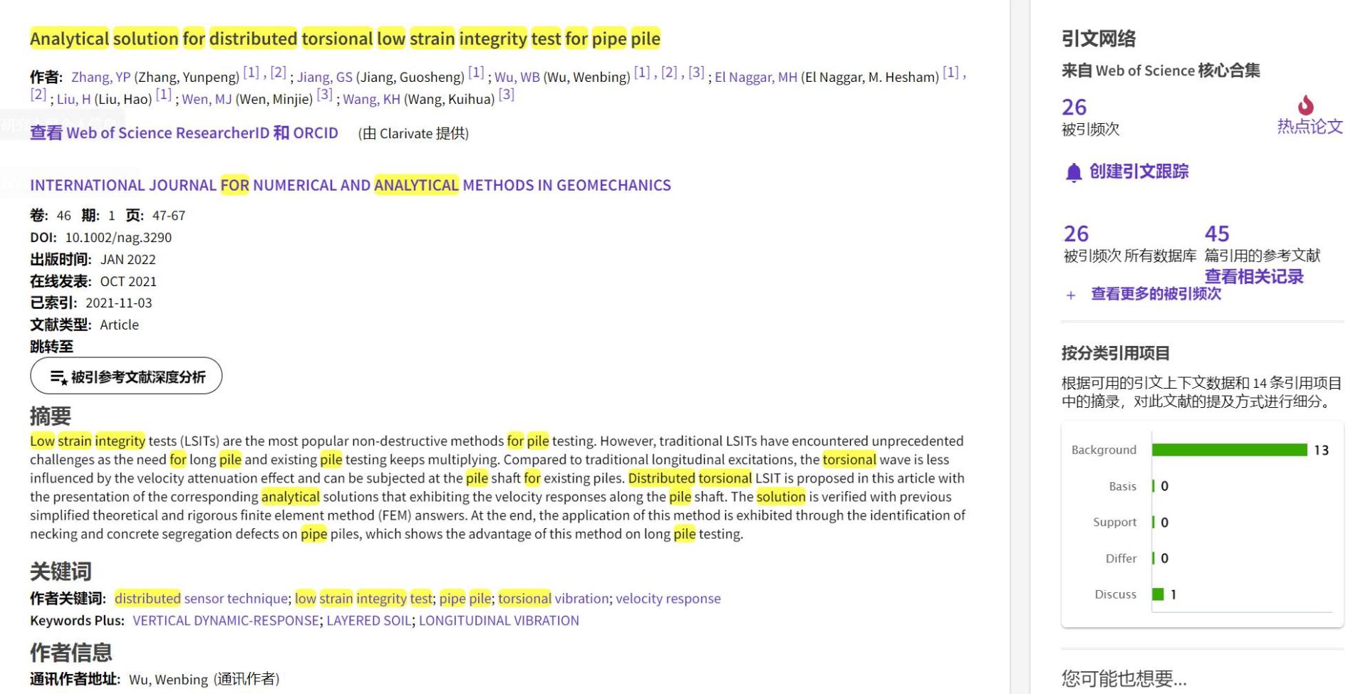 (通讯员 黄静)根据2022年9月基本科学指标数据库(Essential Science Indicators,简称ESI)最新数据显示,十大买球官方网站勘察与基础工程系吴文兵教授团队于2021年在国际岩土工程数值计算权威期刊International Journal for Numerical and Analytical Methods in Geomechanics上发表的学术论文“Analytical solution for distributed torsional low strain integrity test for pipe pile”入选ESI热点论文(Hot Paper)。该论文第一作者为2020级博士研究生张云鹏,通讯作者为吴文兵教授,中国地质大学(武汉)十大买球官方网站为第一署名单位。