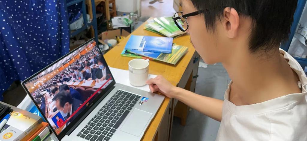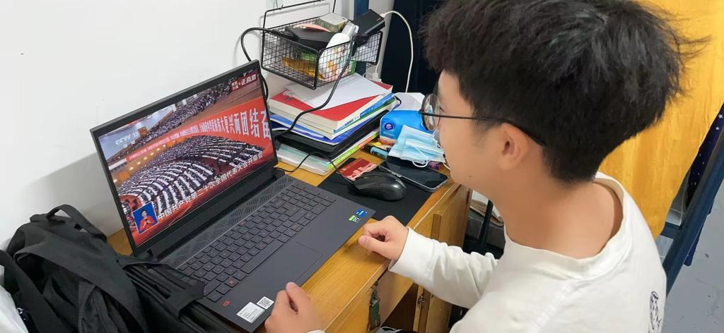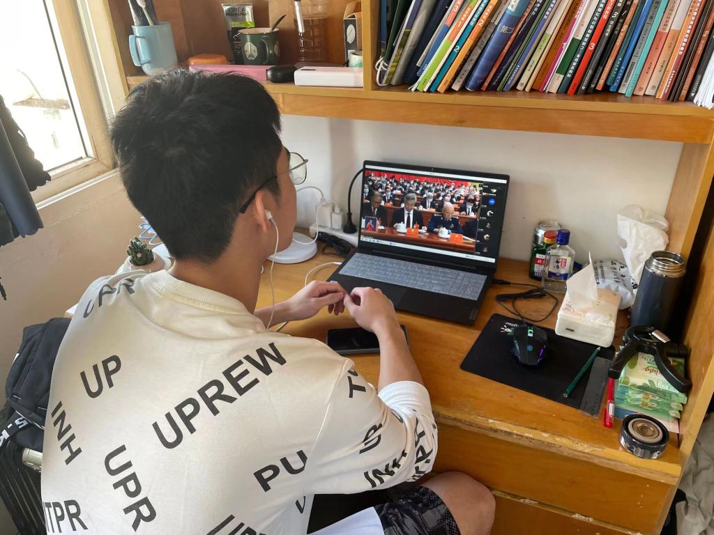 学生在宿舍通过电脑进行收看