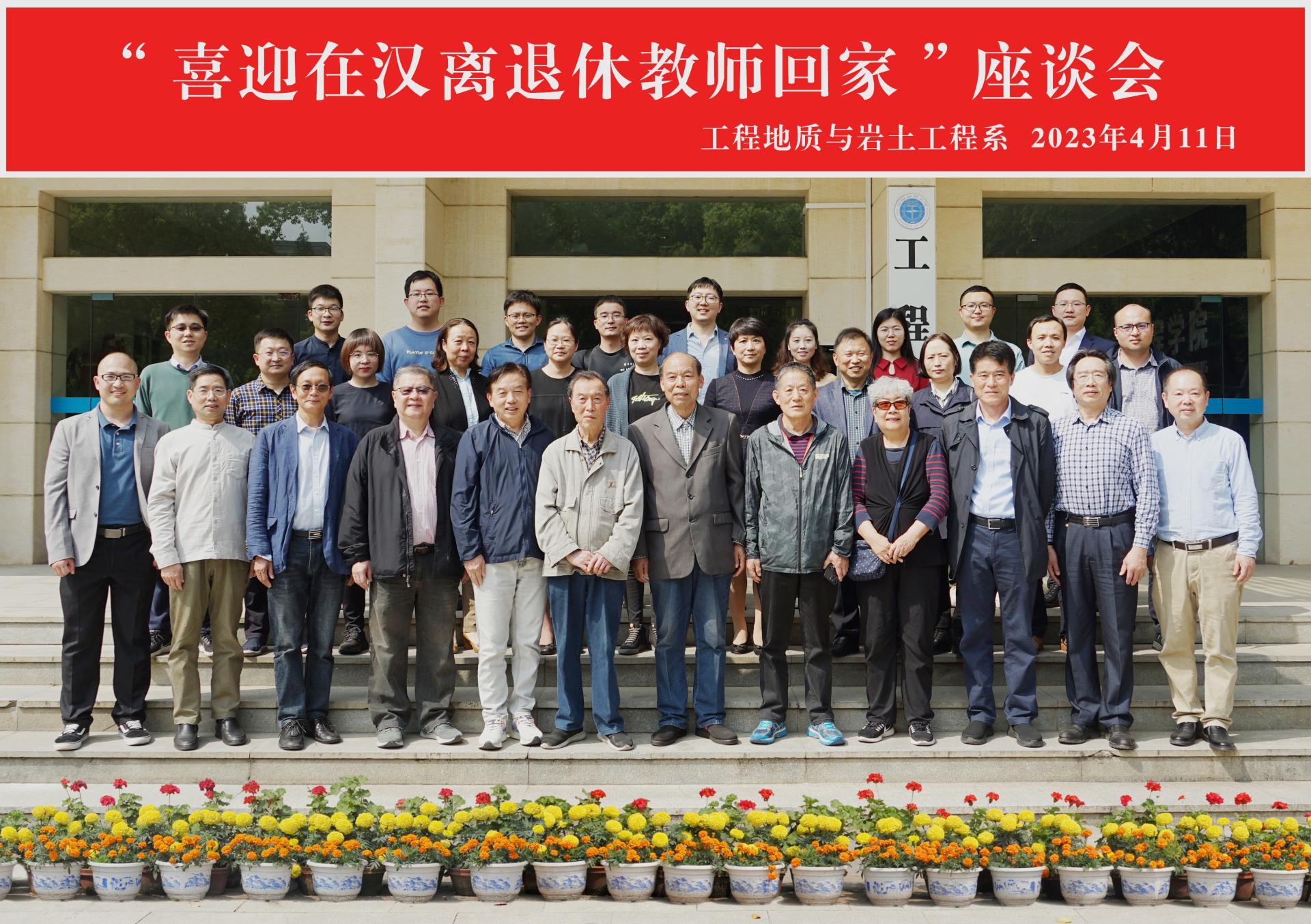 (通讯员 黎伟 王灿2023年04月11日(周二)下午,工程地质与岩土工程系在工程楼201会议室举行了“喜迎在汉离退休教师回家”座谈会。六位系离退休老教师(孟高头、杨顺安、张瑛玲、刘昌辉、余宏明和项伟)以及系中青年教师参加了本次座谈会,座谈会由系党支部书记葛云峰主持。活动开始前,与会教师在工程楼门前集体合影。