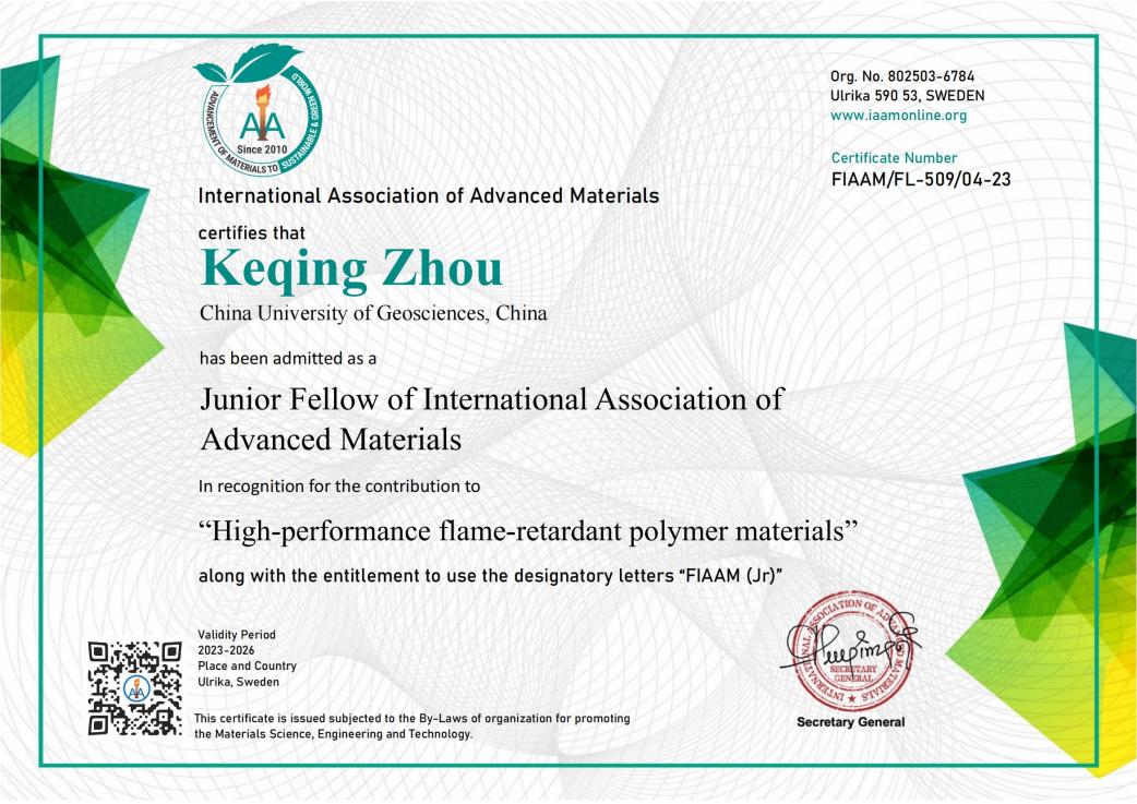 (通讯员 黄静)近日,中国地质大学(武汉)十大买球官方网站周克清特任教授收到国际先进材料学会(International Association of Advanced Materials, IAAM)执委会发来的贺函,祝贺他当选为国际先进材料学会青年会士(Junior Fellow of IAAM, FIAAM)。周克清特任教授受邀在美国奥兰多举办的复合材料研讨会(Composite Materials Congress)上发表题为“Functionalized 2D molybdenum disulphide working on high-performance flame-retardant polymer materials”的IAAM Fellow演讲,会上获颁青年会士“Junior Fellow”证书,以表彰他在“高性能阻燃聚合物材料”领域做出的杰出贡献。