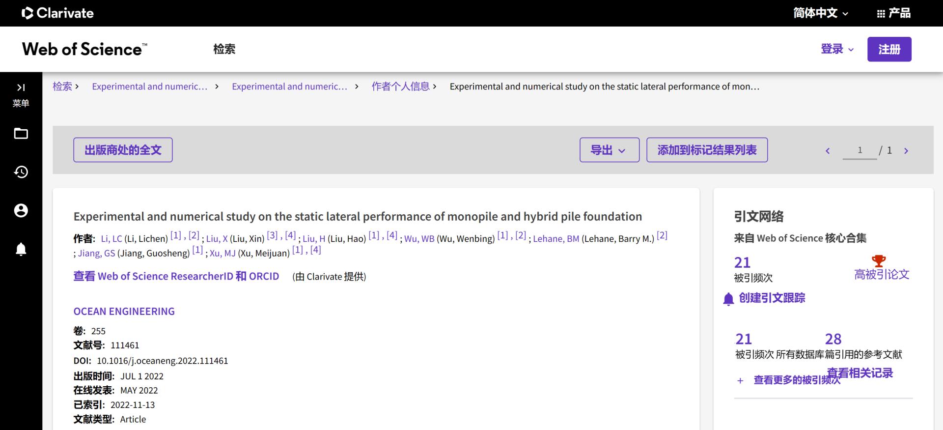 (通讯员 吴文兵)根据2023年6月基本科学指标数据库(Essential Science Indicators,简称ESI)最新数据显示,十大买球官方网站勘察与基础工程系蒋国盛教授团队于2022年在国际海洋岩土领域权威期刊Ocean Engineering上发表的学术论文“Experimental and numerical study on the static lateral performance of monopile and hybrid pile foundation”入选ESI高被引论文。该论文第一作者为勘察与基础工程系博士后李立辰,通讯作者为吴文兵教授,中国地质大学(武汉)十大买球官方网站为第一署名单位。