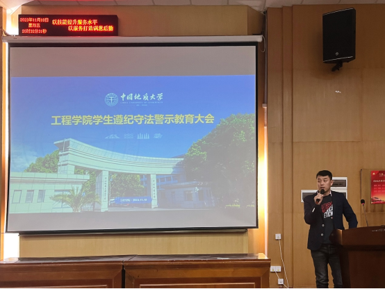 学院党委副书记高晓东讲话。他指出,遵法、懂法、敬法、守法是对社会公民的基本要求,是对高校大学生思想和行为的底线约束,是当代青年成长为堪当民族复兴大任的时代新人的基本保障。作为新时代地大青年,一是要从全面依法治国战略的高度认识宪法法律法规学习的重要性,要认识到青年是法治中国建设的基础和希望,校园是开展青年法治教育的重要阵地,要采取集中学习和自主学习相结合、听取讲座和开展宣讲相结合等方式开展法律法规学习,强化规矩意识和法治思维,学会遵纪守法和合理维权,扣好人生第一粒扣子;二是要从大学生涯规划、职业生涯规划和人生发展规划的视角看待遵守校纪校规的重要性,牢牢把握“纪在法前、纪严于法”的原则,认识到高校纪律规矩对标约束的是“象牙塔”里的高知人群,支持的是“未来社会主义事业的建设者和接班人”的成长与发展,全体大学生理应对自己的思想和行为设置更高的标准和要求,争做遵规守纪的典范;三是要从“做强国建设、民族复兴的主力军”的视角对待大学主责主业,全体工程青年要潜心学课程、做学问、搞科研,用好宝贵的大学时光,产出更多、更高质量、更具影响力的研究成果,同时要注意守牢考风考纪和学术诚信底线。他还嘱咐全体同学,要积极参加心理普查,规律参与体育锻炼,不做“脆皮大学生”,要在初冬季节筑牢宿舍、教室、学习室、实验室用电安全“防火墙”,在校园车辆越来越密集的形势下筑牢交通出行安全“防火墙”,在防电信网络诈骗依然严峻复杂的形势下筑牢财物安全“防火墙”,共同为文明校园建设和个人成长发展营造良好的环境。
