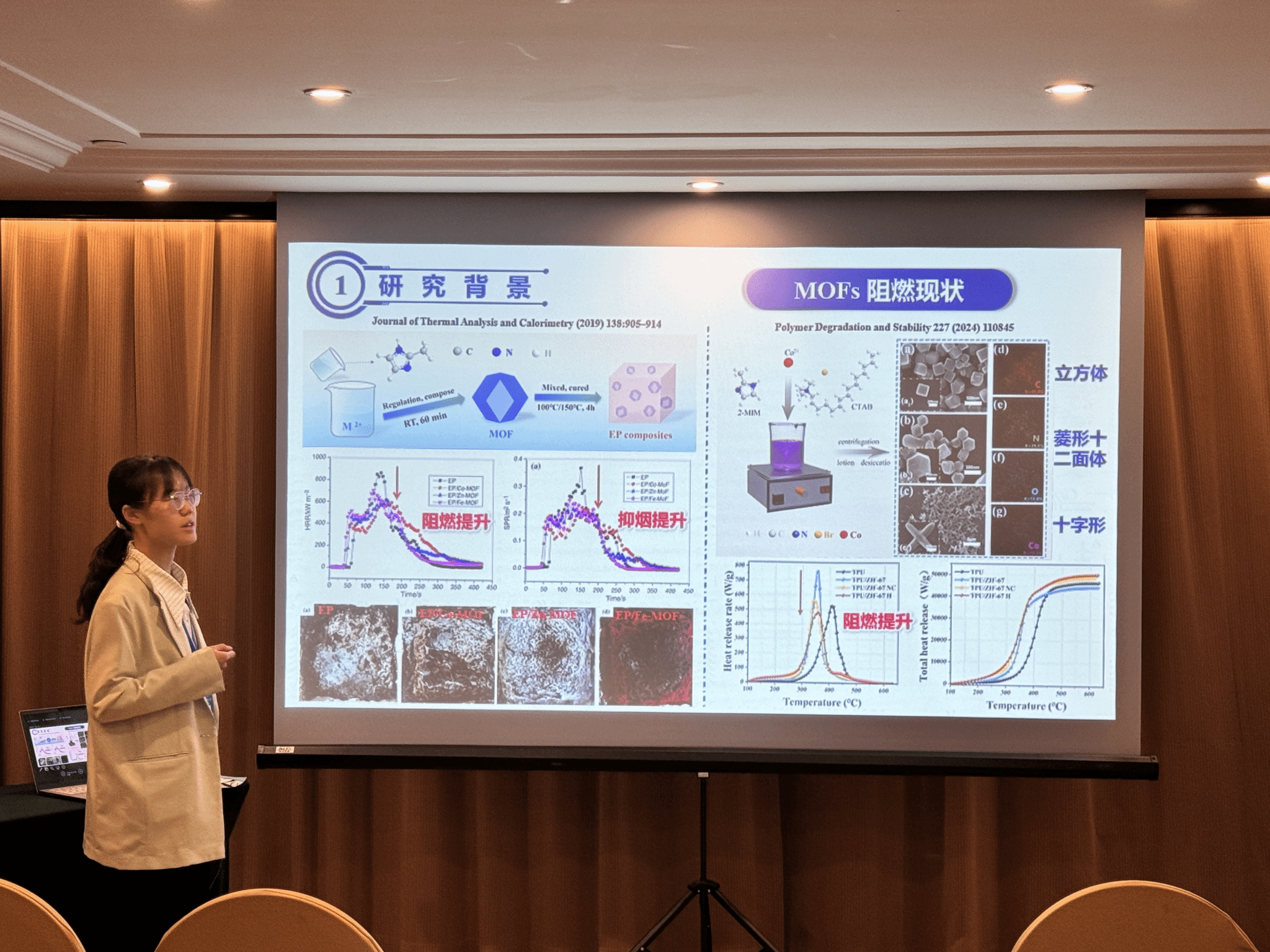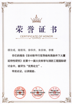 此外,十大买球官网研究生印恋在阻燃耐火论坛作题为“卟啉基有机框架衍生物分子设计及其阻燃增韧研究”报告、罗瑊瑊在阻燃耐火论坛作题为“生物启发微中空MOFs的界面锁定效应:环氧树脂复合材料的耐火与增韧性能优化研究”报告、缪汝成在火灾机理论坛作题为“非对称平行双导线布局条件下火蔓延特性研究”报告,孟祥龙在火灾烟气论坛作题为“空气幕射流作用下的开口溢流发展行为研究”报告,宗志伟在受限空间火灾论坛作题为“墙角型壁面限制条件下的火羽流行为特性研究”报告。其中,陆凯华副教授指导的硕士研究生缪汝成获得会议优秀论文奖。