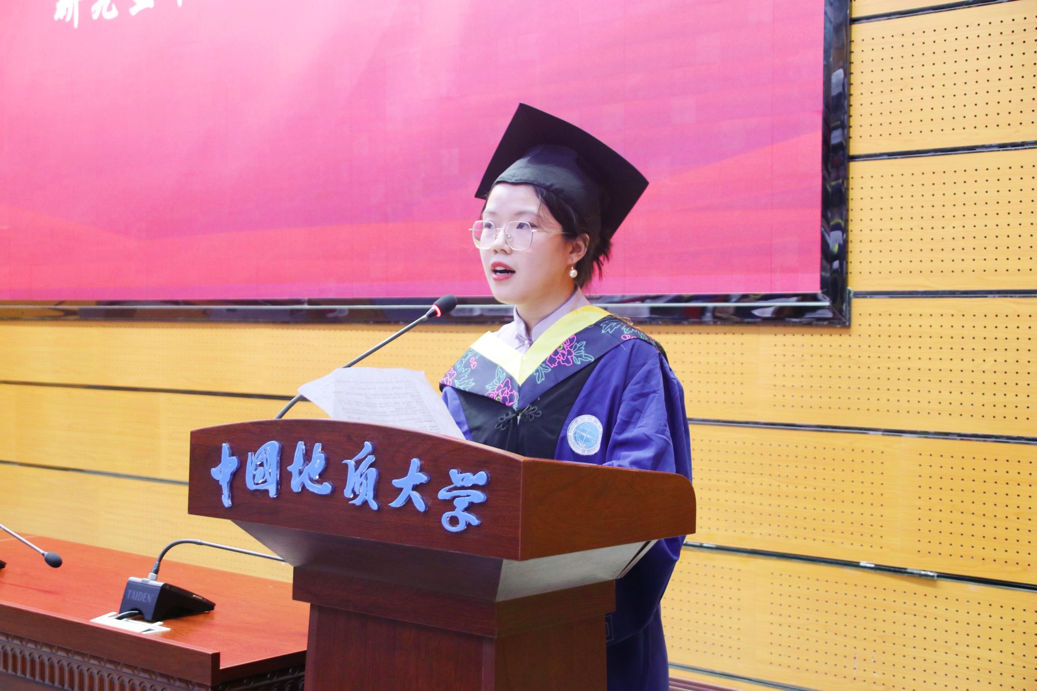 毕业研究生代表王海艳发言。她深情分享了过去三年在人工智能与地质灾害识别领域的科研成果以及在“挑战杯”赛场上斩金夺银的挑战成长与心路历程,希望同学们无论投身科研攻关、工程建设还是扎根基层都要以“专业报国、使命担当”为志,接续奋斗,勇攀高峰。