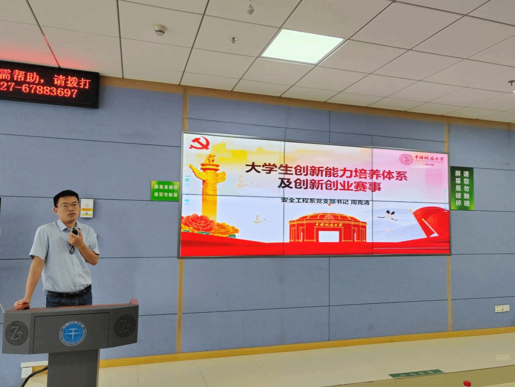 活动伊始,周克清教授从“研究方向+培养体系+赛事解析”三维框架出发,为2024级本科生推开了一扇通往创新创业世界的大门。首先他结合安全科学与工程类专业特色以及研究方向,系统讲解了大学生创新能力阶梯式培养体系,用清晰的逻辑链条串联起课堂学习、实验室探索与竞赛实战的关联。随后聚焦“挑战杯”“国创赛”等重点创新创业赛事,细致详细解读了各赛道的规则细则与评审要点,并通过自身指导的获奖项目案例,讲述了创新创业实践中的“个人成长”。他鼓励本科生们以“敢闯敢创”的锐气叩响创新创业的大门,将实验室中的“科技成果”转化为国家需求的“地大方案”。