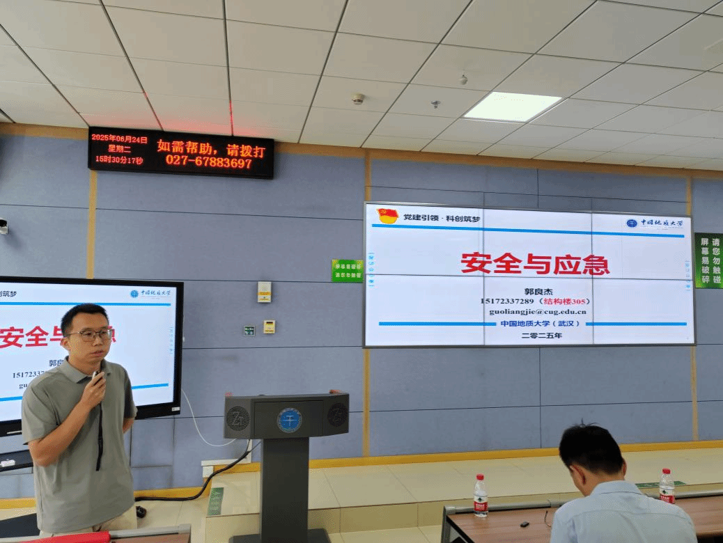 随后,郭良杰副研究员以“生动详实的典型案例”以及“系统详细的专业知识”,层层深入地解析“安全工程”与“应急技术与管理”的专业内涵与外延。既夯实了同学们对专业基础的理解,也为大家在未来专业分流时的方向选择提供了清晰指引,让2024级本科生对专业前景有了更具象、更深刻的认知。此外,他也从发展历程、社团特色、资源支持以及实践育人等方面介绍了安全工程系学术科技类社团——中国地质大学(武汉)“地心守护”社团。他提到,社团作为科创与实践的“孵化站”,鼓励学生通过社团活动积累实践经验、锤炼过硬本领,将专业知识转化为解决实际问题的能力。