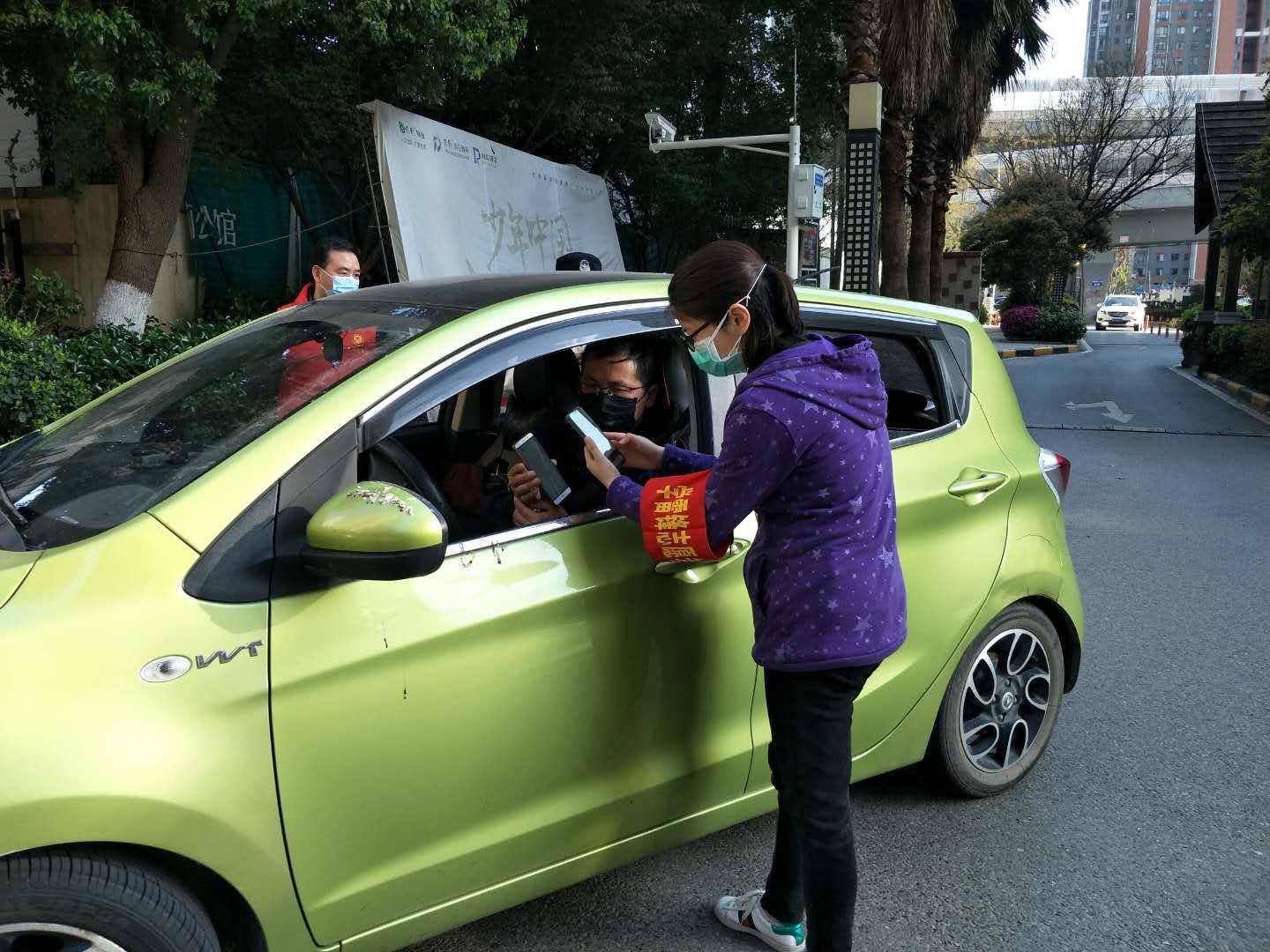 郑君同志在给进出车辆扫码测温