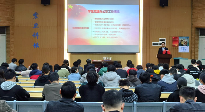 此后,十大买球官方网站第八届学生党建办公室副主任寇桓嘉同志汇报2020年度学生党建办公室工作情况。寇桓嘉同志向参会同志们详细汇报了十大买球官方网站2020年度党员考察、培养及发展转正工作,全年协助院党委开设入党积极分子培训班三期,培养入党积极分子390人,开设发展对象培训班五期,发展党员167人,共有2批党员转正,转正党员128人,完成外校转入42名学生党员的认定工作。另外还介绍了组织生活巡视情况、全体学生党员信息库建立、《十大买球官方网站学生党建工作指导》(第四版)编写等方面内容,最后表示要将学生党建办公室打造为服务院党委和学生党支部的“老黄牛”,以优异成绩向党的百岁华诞献礼。