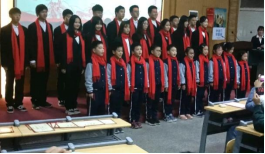 | 杨济源、王凯超、刘盼盼同三等奖获奖同学合影留念 | 附小小朋友合唱《歌唱祖国》 |