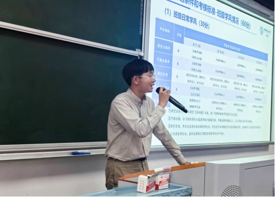 2024级辅导员彭友元介绍《中国地质大学(武汉)十大买球官方网站“优良学风示范班”创建评选办法》。他从“优良学风示范班”总体要求、创建流程、考核指标、奖惩办法等四个方面进行介绍,重点解读了班级政治理论学习、遵纪守法与文明修养、集体观念、班级制度建设、班级干部表现等5项班级综合表现指标,课堂出勤、早操出勤、课堂表现、作业完成情况、自习组织情况等5项班级日常学风指标,平均学分绩点、优秀率、及格率和英语四级通过率等4项班级课程成绩指标,以及学生参加科技创新活动等附加分项目指标。他要求同学们仔细阅读创建办法文件,对照量化评估考核指标,积极开展富有班级特色的学风建设活动。
